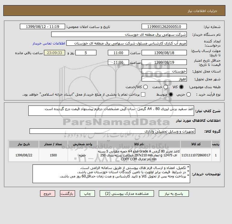 شرح کلی نیاز: اغذ سفید برش لیزری A4 ، 80 گرمی سان کپی مشخصات درفرم پیشنهاد قیمت درج گردیده است