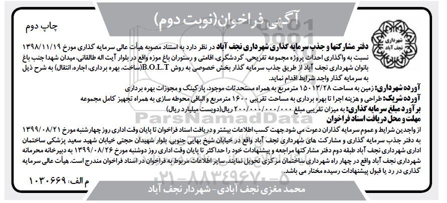 دفتر مشارکتها و جذب سرمایه گذاری شهرداری نجف آباد در نظر دارد نسبت به واگذاری احداث پروژه مجموعه تفریحی ، گردشگری ، اقامتی و رستوران باغ موزه واقع در بلوار ایت اله طالقانی میدان شهدا جنب باغ بانوان شهرداری نجف آباد از طریق جذب سرمایه گذار بخش خصوصی به روش BOLT ساخت بهره برداری اجاره انتقال به شرح ذیل به سرمایه گذار واجد شرایط اقدام نماید