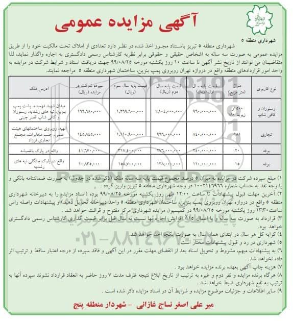 شهرداری منطقه 5 تبریز به استناد مجوز اخذ شده در نظر دارد تعدادی از املاک تحت مالکیت خود را از طریق مزایده عمومی به صورت سه ساله به اشخاص حقیقی و حقوقی برابر نظریه کارشناس رسمی دادگستری به اجاره واگذار نماید لذا متقاضیان می توانند از تاریخ نشر آگهی تا ساعت 10 روز یکشنبه مورخ 99.08.25 جهت دریافت اسناد و شرایط شرکت در مزایده به واحد امور قراردادهای منطقه واقع در دروازه تهران، روبروی پمپ بنزین، ساختمان شهرداری منطقه 5 مراجعه نمایند.