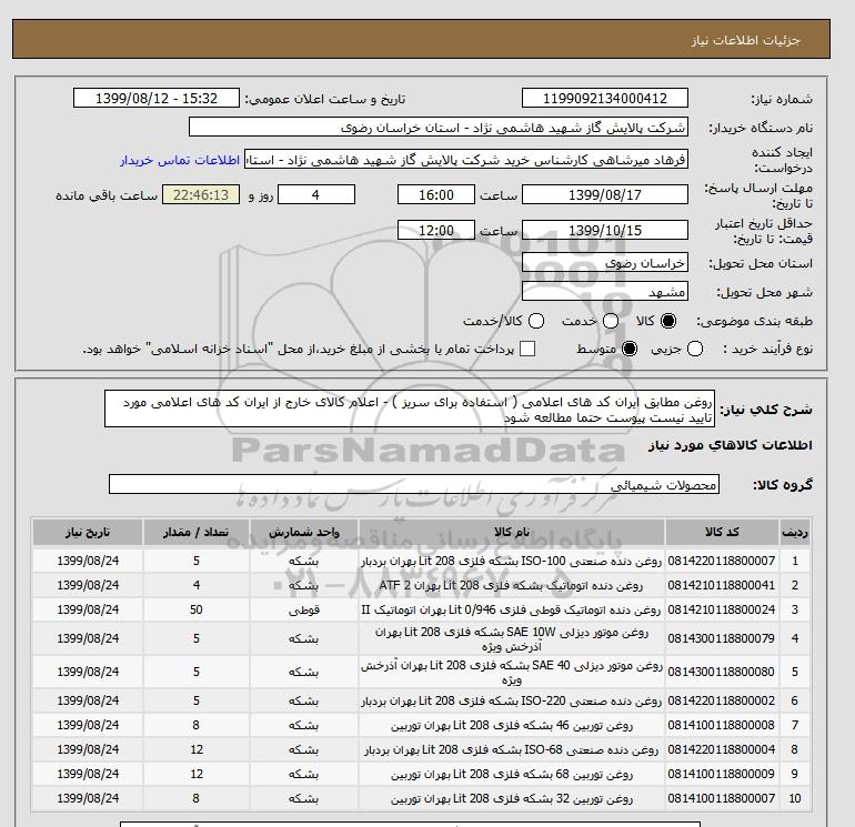 نام دستگاه خریدار:شرکت پالایش گاز شهید هاشمی نژاد - استان خراسان رضوی