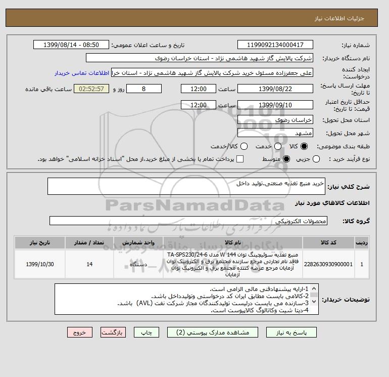 شرح کلی نیاز: خرید منبع تغذیه صنعتی.تولید داخل