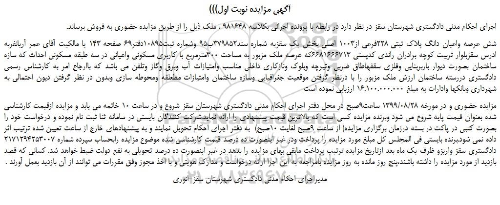 اجرای احکام مدنی دادگستری شهرستان سقز در نظر دارد در رابطه با پرونده اجرائی بکلاسه 981648 ، ملک ذیل را از طریق مزایده حضوری به فروش برساند.