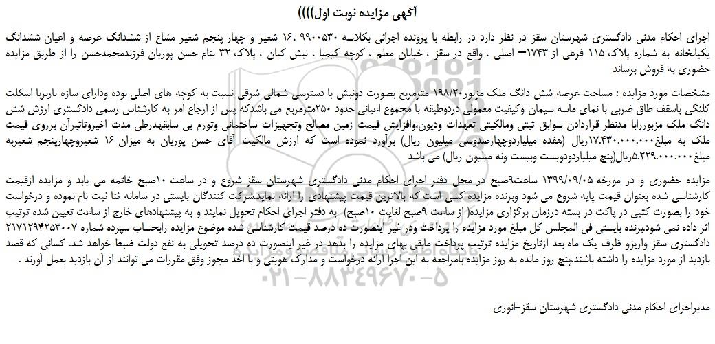اجرای احکام مدنی دادگستری شهرستان سقز در نظر دارد در رابطه با پرونده اجرائی بکلاسه 9900530 ،16 شعیر و چهار پنجم شعیر مشاع از ششدانگ عرصه و اعیان ششدانگ یکبابخانه به شماره پلاک 115 فرعی از 1743– اصلی ، واقع در سقز ، خیابان معلم ، کوچه کیمیا ، نبش کیان ، پلاک 32 بنام حسن پوریان فرزندمحمدحسن را از طریق مزایده حضوری به فروش برساند