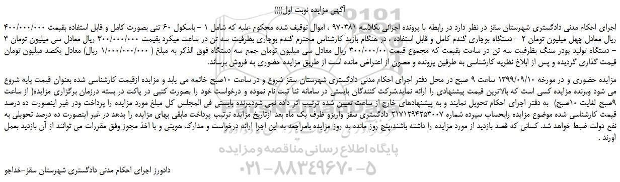 اجرای احکام مدنی دادگستری شهرستان سقز در نظر دارد در رابطه با پرونده اجرائی بکلاسه 970381 ، اموال توقیف شده محکوم علیه که شامل 1 - باسکول 60 تنی بصورت کامل و قابل استفاده بقیمت 400/000/000 ریال معادل چهل میلیون تومان 2 - دستگاه بوجاری گندم کامل و قابل استفاده ، در هنگام بازید کارشناس محترم گندم بوجاری بظرفیت سه تن در ساعت میکرد بقیمت 300/000/000 ریال معادل سی میلیون تومان 3 - دستگاه تولید پودر سنگ بظرفیت سه تن در ساعت بقیمت که مجموع قیمت 300/000/00 ریال معادل سی میلیون تومان جمع سه دستگاه فوق الذکر به مبلغ ( 1/000/000/000 ریال) معادل یکصد میلیون تومان قیمت گذاری گردیده و پس از ابلاغ نظریه کارشناسی به طرفین پرونده و مصون از اعتراض مانده است از طریق مزایده حضوری به فروش برساند.