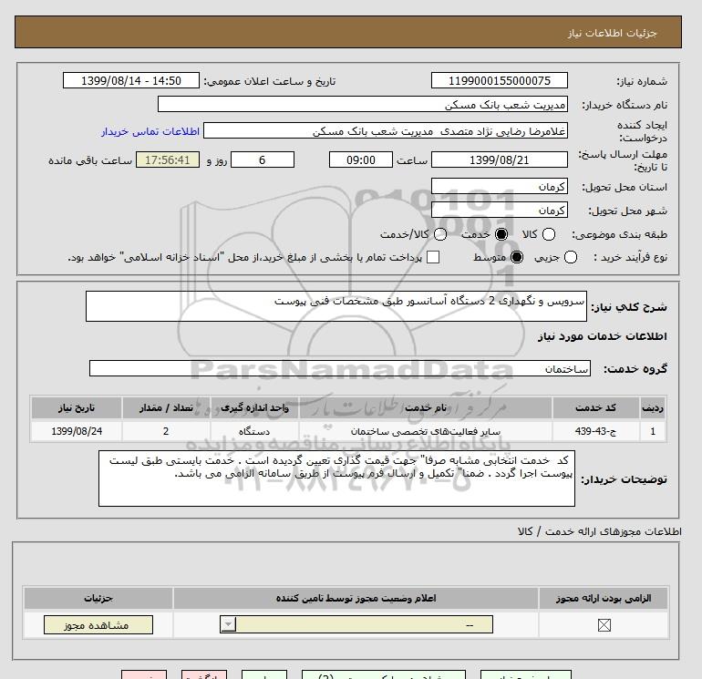 شرح کلی نیاز: سرویس و نگهداری 2 دستگاه آسانسور طبق مشخصات فنی پیوست