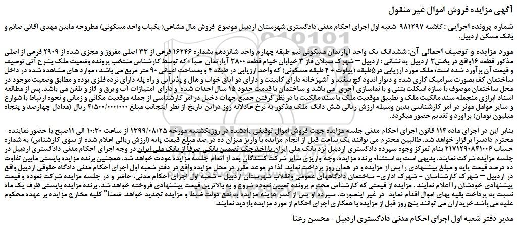 شماره پرونده اجرایی : کلاسه 981297 شعبه اول اجرای احکام مدنی دادگستری شهرستان اردبیل موضوع فروش مال مشاعی( یکباب واحد مسکونی) مطروحه مابین مهدی آقائی صائم و بانک مسکن اردبیل.