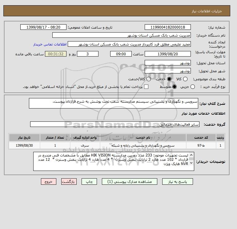 شرح کلی نیاز: سرویس و نگهداری و پشتیبانی سیستم مداربسته شعب تحت پوشش به شرح قرارداد پیوست.