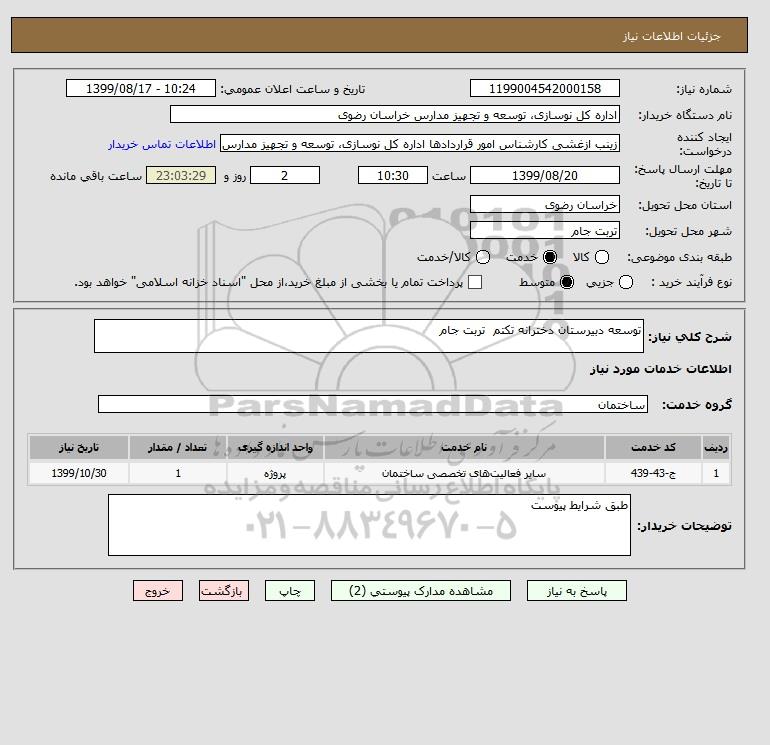 شرح کلی نیاز: توسعه دبیرستان دخترانه تکتم تربت جام