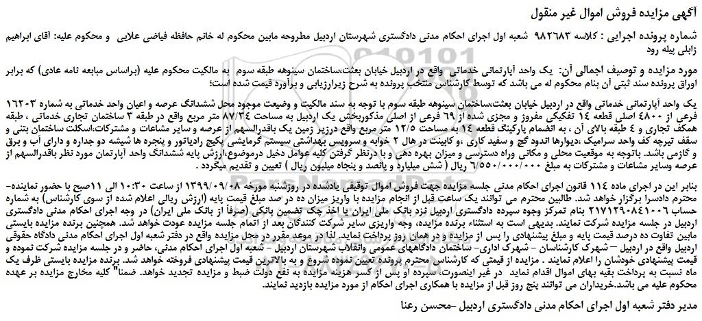 مورد مزایده و توصیف اجمالی آن: یک واحد آپارتمانی خدماتی واقع در اردبیل خیابان بعثت،ساختمان سینوهه طبقه سوم به مالکیت محکوم علیه (براساس مبابعه نامه عادی) که برابر اوراق پرونده سند ثبتی آن بنام محکوم له می باشد که توسط کارشناس منتخب پرونده به شرح زیرارزیابی و برآورد قیمت شده است؛