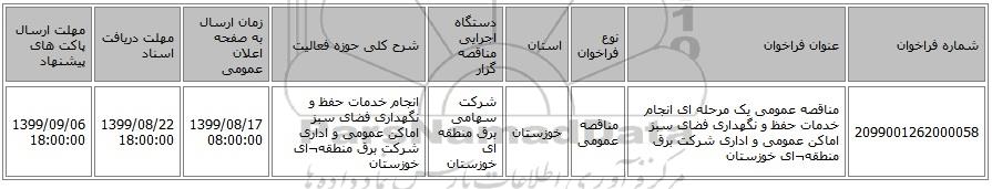 | 2099001262000058 | مناقصه عمومی یک مرحله ای انجام خدمات حفظ و نگهداری فضای سبز اماکن عمومی و اداری شرکت برق منطقه¬ای خوزستان | مناقصه عمومی | خوزستان | شرکت سهامی برق منطقه ای خوزستان | انجام خدمات حفظ و نگهداری فضای سبز اماکن عمومی و اداری شرکت برق منطقه¬ای خوزستان | 1399/08/17 08:00:00 | 1399/08/22 18:00:00 | 1399/09/06 18:00:00 |