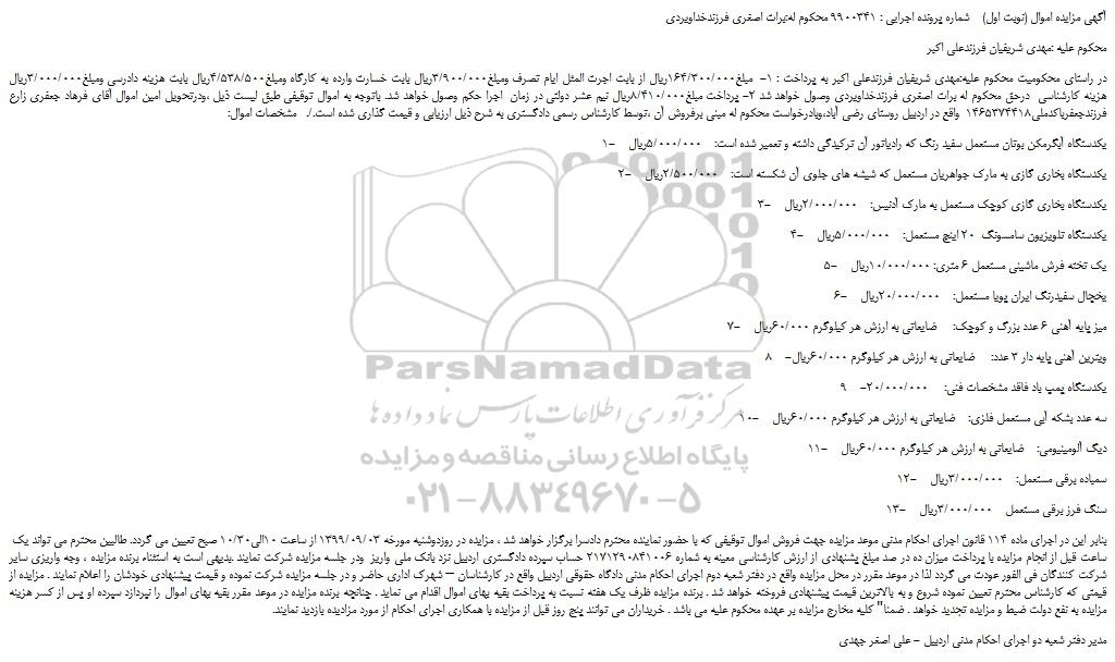 آگهی مزایده اموال (نوبت اول) شماره پرونده اجرایی : 9900341 محکوم له:برات اصغری فرزندخداویردی