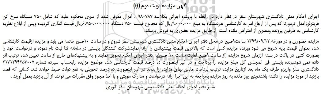 اجرای احکام مدنی دادگستری شهرستان سقز در نظر دارد در رابطه با پرونده اجرائی بکلاسه 980787 ، اموال معرفی شده از سوی محکوم علیه که شامل 750 دستگاه سرخ کن فریتولوزامدل ترموزتا که پس از ارجاع امر به کارشناسی هردستگاه به مبلغ 9.000.000ریال که مجموع قیمت 750 دستگاه 6.750.000.000ریال قیمت گذاری گردیده وپس از ابلاغ نظریه کارشناسی به طرفین پرونده ومصون از اعتراض مانده است از طریق مزایده حضوری به فروش برساند.