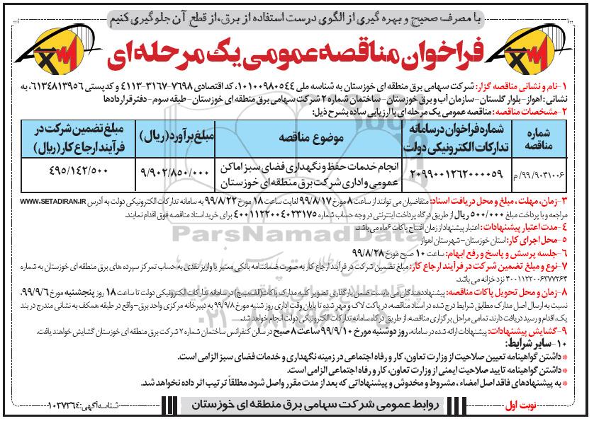 | 99/9041006/م | 2099001262000059 | انجام خدمات حفظ و نگهداری فضای سبز اماکن عمومی و اداری شرکت برق منطقه ای خوزستان | 9.902.850.000 | 495.142.500 |