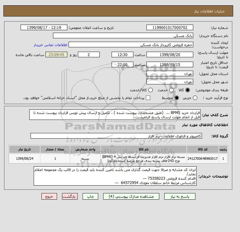 شرح کلی نیاز: قرارداد خرید BPMS ... (طبق مشخصات پیوست شده ) ، تکمیل و ارسال پیش نویس قرارداد پیوست شده تا قبل از اتمام مهلت ارسال پاسخ الزامیست .