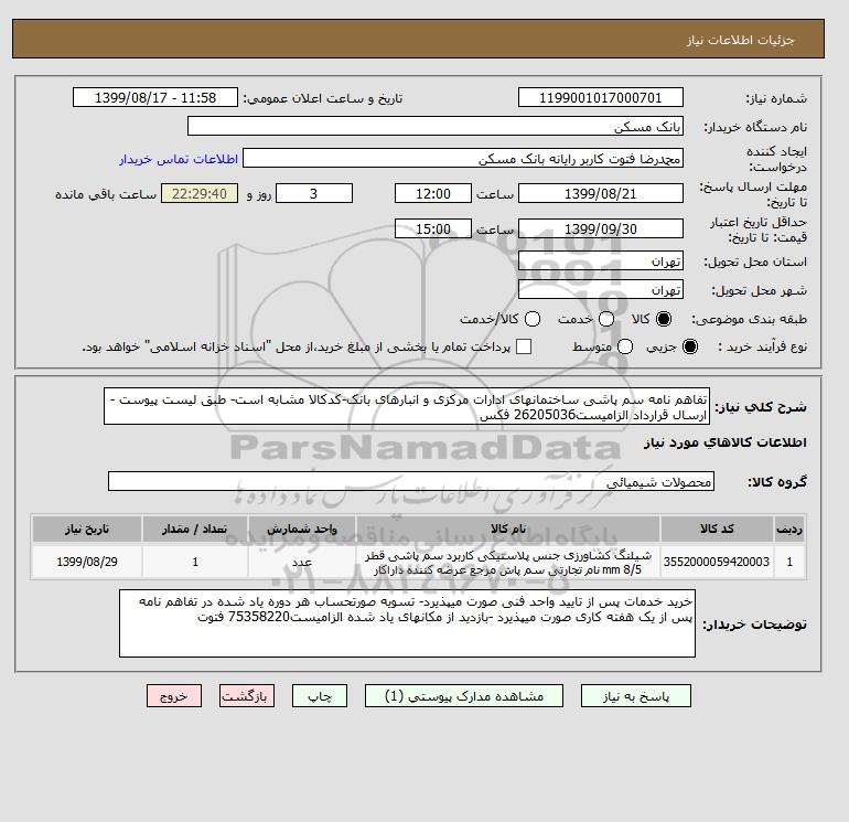 شرح کلی نیاز: تفاهم نامه سم پاشی ساختمانهای ادارات مرکزی و انبارهای بانک-کدکالا مشابه است- طبق لیست پیوست - ارسال قرارداد الزامیست26205036 فکس