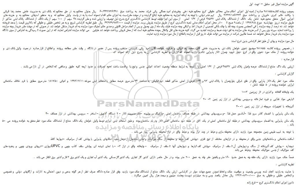 بموجب پرونده کلاسه981855 صادره از شعبه اول اجرای احکام مدنی محاکم حقوقی کرج محکوم علیه : علی وعلیرضاو امید همگی ربانی فرزند محمد به پرداخت مبلغ 60/443/726/491 ریال بعنوان محکوم به در حق محکوم له بانک دی به مدیریت عاملی محمد رضا قربانی با وکالت خانم کبری خاوریان و پرداخات مبلغ 3/322/186/324 ریال نیم عشر دولتی. با توجه به اینکه اجراییه به محکوم علیه ابلاغ گردیده و در مهلت مقررنسبت به اجرای حکم اقدام ننموده است بنا به در واست وکیل محکوم له و به منظور استیفای محکوم به و هزینه های اجرایی اموال متعلق محوم علیه شامل یک دانگ از ششدانگ پلاک ثبتی 48537 فرعی از 162 اصلی از سوی این اجرا توقیف توسط کارشناسی دادگستری کرج بشرح ذیل توصیف و ارزیابی شده و مقرر گردیده 48 سهم از 100 سهم از یک دانگ از ششدانگ پلاک ثبتی مذکور از طریق مزایده درروز چهارشنبه مورخ 1399/9/5 از ساعت9 صبح تا 10در محل اجرای احکام مدنی شعبه دادگستری کرج از طریق مزایده بفروش برسد. مزایده از قیمت 63/939/984/000 ریال طبق نظریه کارشناس شروع و به هر شخص حقیقی و حقوقی که بالاترین قیمت را بدهد فروخته خواهد شد. ده درصد از وجه مزایده را فی المجلس بصورت وجه نقد یا چک بانکی تضمینی از خریدار اخذ و الباقی وجه مزایده ظرف یک ماه از وی وصول و پس از انجام مراحل قانونی و صدور حکم تملیک مورد مزایده به نام خریدار منتقل خواهد شد. در صورتی که در مهلت مقرر خریدار وجه مزایده را پرداخت ننماید سپرده وی پس از کسر هزینه های مزایده به نفع دولت ضبط و مزایده تجدید می گردد. کلیه هزینه های نقل وانتقال بعهده محکوم علیه است که از محل فروش پرداخت خواهد شد طرفین می توانند مزایده اعتراض نمایند که در این صورت تا رسیدگی به اعتراض از سوی دادگاه مورد مزایده بنام خریدار منتقل نخواهد شد ضمنا طالبین شرکت در مزایده می توانند ظرف 5 روز قبل از مزایده بااطلاع از مال مورد مزایده بازدید نمایند.