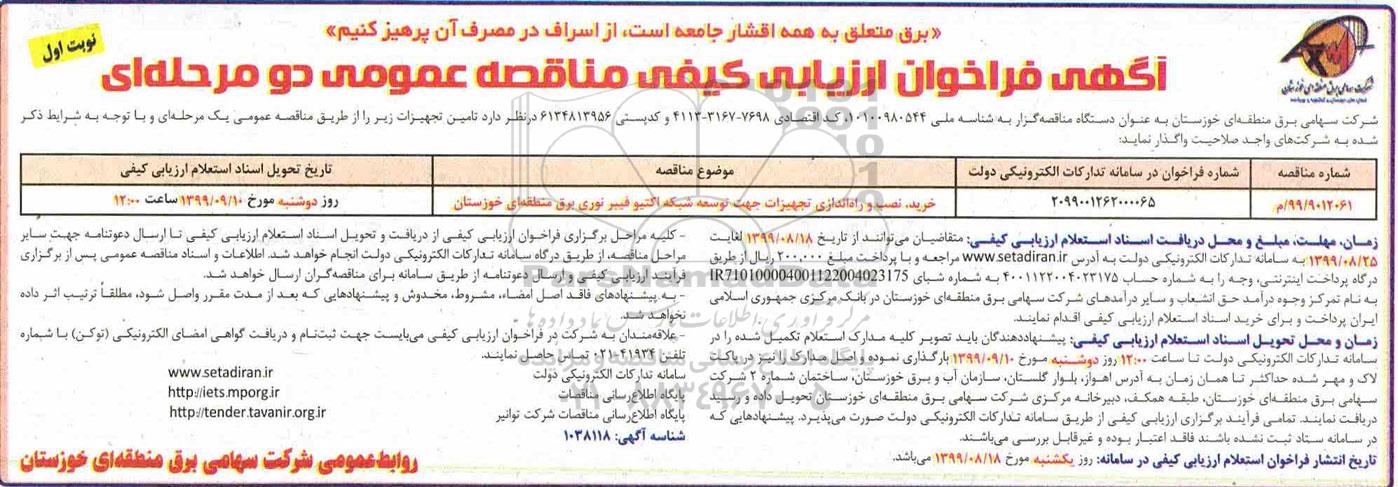 | 99/9012061/م | 209900126200065 | خرید، نصب و راه اندازی تجهیزات جهت توسعه شبکه اکتیو فیبر نوری برق منطقه ای خوزستان | روز دوشنبه مورخ 99.9.10 ساعت 12 |