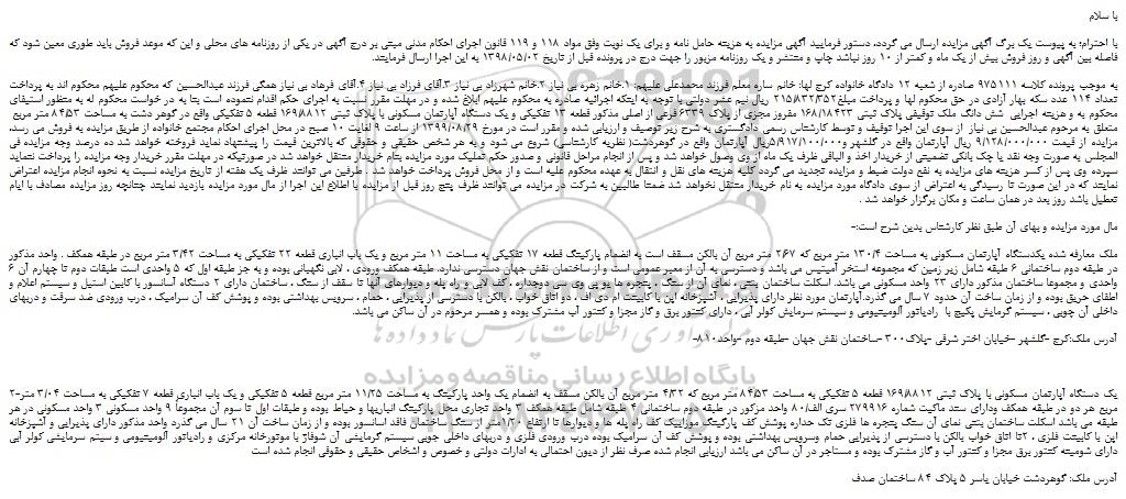 به موجب پرونده کلاسه 975111 صادره از شعبه 12 دادگاه خانواده کرج لها: خانم ساره معلم فرزند محمدعلی علیهم: 1.خانم زهره بی نیاز 2.خانم شهرزاد بی نیاز 3.آقای فرزاد بی نیاز 4.آقای فرهاد بی نیاز همگی فرزند عبدالحسین که محکوم علیهم محکوم اند به پرداخت تعداد 114 عدد سکه بهار آزادی در حق محکوم لها و پرداخت مبلغ215/832/352 ریال نیم عشر دولتی با توجه به اینکه اجرائیه صادره به محکوم علیهم ابلاغ شده و در مهلت مقرر نسبت به اجرای حکم اقدام ننموده است بنا به در خواست محکوم له به منظور استیفای محکوم به و هزینه اجرایی  شش دانگ ملک توقیفی پلاک ثبتی 168/18423 مفروز مجزی از پلاک 6339 فرعی از اصلی مذکور قطعه 13 تفکیکی و یک دستگاه آپارتمان مسکونی با پلاک ثبتی 169/8812 قطعه 5 تفکیکی واقع در گوهر دشت به مساحت 84/53 متر مربع  متعلق به مرحوم عبدالحسین بی نیاز  از سوی این اجرا توقیف و توسط کارشناس رسمی دادگستری به شرح زیر توصیف و ارزیابی شده و مقرر است در مورخ 1399/08/29 از ساعت 9 لغایت 10 صبح در محل اجرای احکام مجتمع خانواده از طریق مزایده به فروش می رسد، مزایده از قیمت 9/128/000/000 ریال آپارتمان واقع در گلشهر و5/917/100/000ریال آپارتمان واقع در گوهردشت( نظریه کارشناسی) شروع می شود و به هر شخص حقیقی و حقوقی که بالاترین قیمت را پیشنهاد نماید فروخته خواهد شد ده درصد وجه مزایده فی المجلس به صورت وجه نقد یا چک بانکی تضمینی از خریدار اخذ و الباقی ظرف یک ماه از وی وصول خواهد شد و پس از انجام مراحل قانونی و صدور حکم تملیک مورد مزایده بنام خریدار منتقل خواهد شد در صورتیکه در مهلت مقرر خریدار وجه مزایده را پرداخت ننماید سپرده وی پس از کسر هزینه های مزایده به نفع دولت ضبط و مزایده تجدید می گردد کلیه هزینه های نقل و انتقال به عهده محکوم علیه است و از محل فروش پرداخت خواهد شد . طرفین می توانند ظرف یک هفته از تاریخ مزایده نسبت به نحوه انجام مزایده اعتراض نمایند که در این صورت تا رسیدگی به اعتراض از سوی دادگاه مورد مزایده به نام خریدار منتقل نخواهد شد ضمنا طالبین به شرکت در مزایده می توانند ظرف پنج روز قبل از مزایده با اطلاع این اجرا از مال مورد مزایده بازدید نمایند چنانچه روز مزایده مصادف با ایام تعطیل باشد روز بعد در همان ساعت و مکان برگزار خواهد شد .