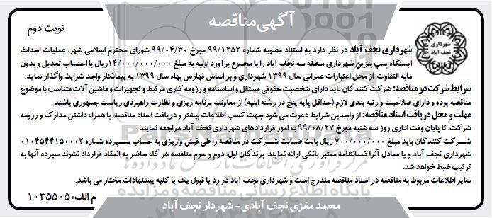شورای محترم اسلامی شهر، عملیات احداث ایستگاه پمپ بنزین شهرداری منطقه سه نجف آباد را با مجموع برآورد اولیه به مبلغ 14.000.000.000 ریال با احتساب تعدیل و بدون مابه التفاوت از محل اعتبارات عمرانی سال 99 شهرداری و براساس فهارس بها سال 99 به پیمانکار واجد شرایط واگذار نماید