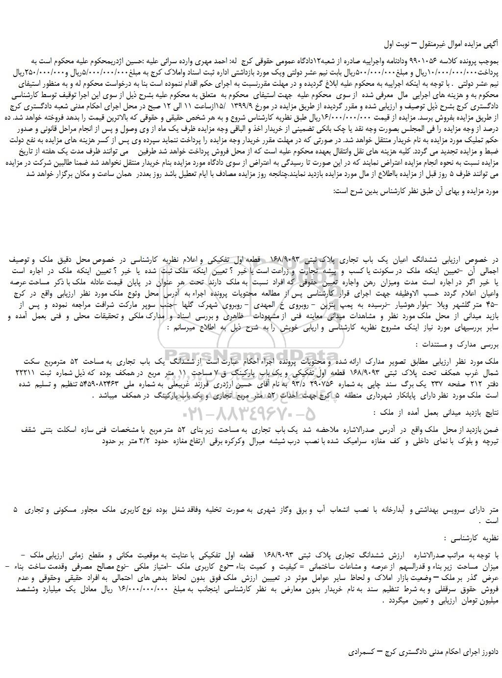 ملک مورد  نظر  ارزیابی  مطابق  تصویر  مدارک  ارائه شده  و محتویات  پرونده  اجراء احکام  عبارت است  از ششدانگ  یک  باب  تجاری  به مساحت  52  مترمربع  سکت  شمال  غرب  همکف  تحت  پلاک  ثبتی  168/9093  قطعه  اول تفکیکی  و یک باب  پارکینگ  ق 7 مساحت  11  متر  مربع  در همکف  بوده  که ذیل شماره  ثبت  22211 دفتر  212  صفحه  237  یک برگ  سند  چاپی  به شماره  290756  د/93  به نام آقای  حسین ارژدری  فرزند  غریبعلی  به شماره  ملی  5459082463 تنظیم  و تسلیم  شده است  ملک مورد  نظر دارای  پایانکار  شهرداری  منطقه  5  کرج جهت  احداث  52  متر  مربع  تجاری  و یک باب پارکینگ  در همکف  میباشد  .