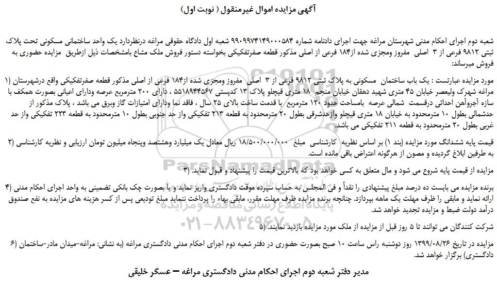 شعبه دوم اجرای احکام مدنی شهرستان مراغه جهت اجرای دادنامه شماره 9909974149000584 شعبه اول دادگاه حقوقی مراغه درنظردارد یک واحد ساختمانی مسکونی تحت پلاک ثبتی 9812 فرعی از 3  اصلی  مفروز ومجزی شده از184 فرعی از اصلی مذکور قطعه صفرتفکیکی بخواسته دستور فروش ملک مشاع بامشخصات ذیل ازطریق  مزایده حضوری به فروش میرساند: