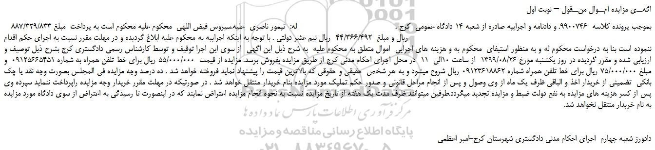 بموجب پرونده کلاسه 9900746. و دادنامه و اجراییه صادره از شعبه 14 دادگاه عمومی کرج . له: تیمور ناصری علیه.سیروس فیض اللهی محکوم علیه محکوم است به پرداخت مبلغ 887/329/833 ریال و مبلغ 44/366/492 ریال نیم عشر دولتی . با توجه به اینکه اجراییه به محکوم علیه ابلاغ گردیده و در مهلت مقرر نسبت به اجرای حکم اقدام ننموده است بنا به درخواست محکوم له و به منظور استیفای محکوم به و هزینه های اجرایی اموال متعلق به محکوم علیه به شرح ذیل این اگهی از سوی این اجرا توقیف و توسط کارشناس رسمی دادگستری کرج بشرح ذیل توصیف و ارزیابی شده و مقرر گردیده در روز یکشنبه مورخ 1399/08/26 از ساعت 10الی 11 در محل اجرای احکام مدنی کرج از طریق مزایده بفروش برسد. مزایده از قیمت 55/000/000 ریال برای خط تلفن همراه به شماره 09125665451 و مبلغ 75/000/000 ریال برای خط تلفن همراه شماره 09123618862 ریال شروع میشود و به هر شخص حقیقی و حقوقی که بالاترین قیمت را پیشنهاد نماید فروخته خواهد شد . ده درصد وجه مزایده فی المجلس بصورت وجه نقد یا چک بانکی تضمینی از خریدار اخذ و الباقی ظرف یک ماه از وی وصول و پس از انجام مراحل قانونی و صدور حکم تملیک مورد مزایده بنام خریدار منتقل خواهد شد . در صورتیکه در مهلت مقرر خریدار وجه مزایده راپرداخت ننماید سپرده وی پس از کسر هزینه های مزایده به نفع دولت ضبط و مزایده تجدید میگردد.طرفین میتوانند ظرف مدت یک هفته از تاریخ مزایده نسبت به نحوه انجام مزایده اعتراض نمایند که در اینصورت تا رسیدگی به اعتراض از سوی دادگاه مورد مزایده به نام خریدار منتقل نخواهد شد.
