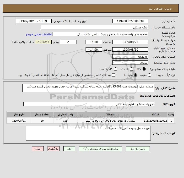 شرح کلی نیاز: صندلی نیلپر کارمندی مدل K700B باگارانتی سه ساله شرکت نیلپر- هزینه حمل بعهده تامین کننده میباشد