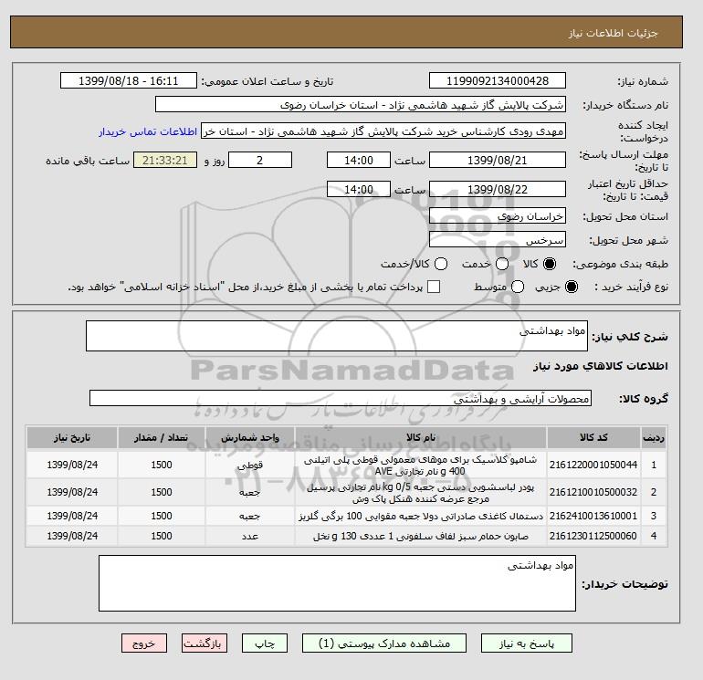 نام دستگاه خریدار:شرکت پالایش گاز شهید هاشمی نژاد - استان خراسان رضوی