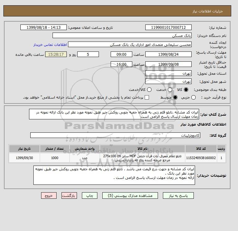 استعلام ایران کد مشابه .تابلو قلم زنی به همراه جعبه چوبی روکش جیر طبق نمونه مورد نظر این بانک ارائه نمونه در زمان مهلت ارسال پاسخ الزامی است , استعلام ایران کد مشابه .تابلو قلم زنی به همراه جعبه چوبی روکش جیر طبق نمونه مورد نظر این بانک ارائه نمونه در زمان مهلت ارسال پاسخ الزامی است