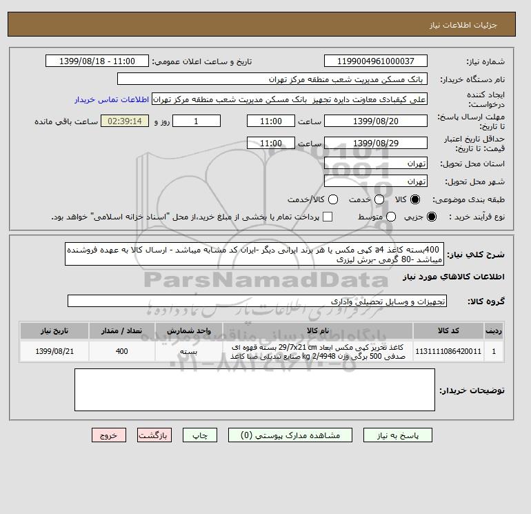 نام دستگاه خریدار: بانک مسکن مدیریت شعب منطقه مرکز تهران