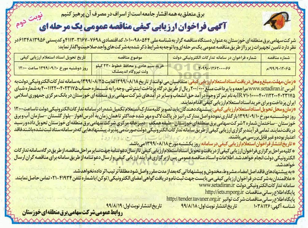 شرکت سهامی برق منطقه ای خوزستان به شناسه ملی 10100980544 کد اقتصادی 7698-3167-4113 و کدپستی 6134813956 در نظر دارد تامین تجهیزات زیر را از طریق مناقصه عمومی و با توجه به شرایط ذکر شده به شرکت های واجد صلاحیت واگذار نماید