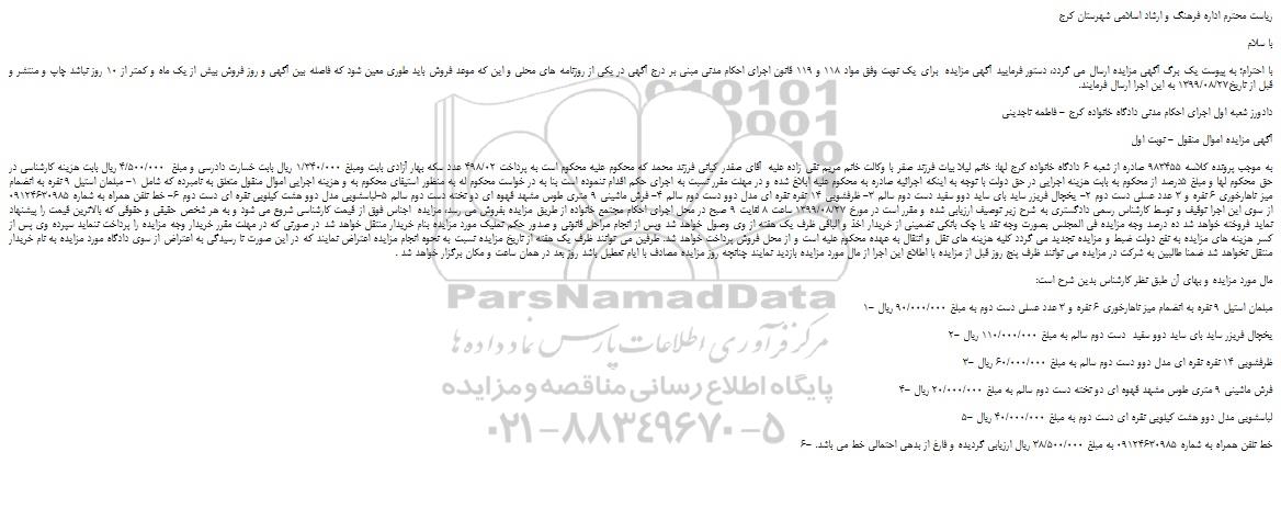 با احترام؛ به پیوست یک برگ آگهی مزایده ارسال می گردد، دستور فرمایید آگهی مزایده برای یک نوبت وفق مواد 118 و 119 قانون اجرای احکام مدنی مبنی بر درج آگهی در یکی از روزنامه های محلی و این که موعد فروش باید طوری معین شود که فاصله بین آگهی و روز فروش بیش از یک ماه و کمتر از 10 روز نباشد چاپ و منتشر و قبل از تاریخ1399/08/27 به این اجرا ارسال فرمایند.