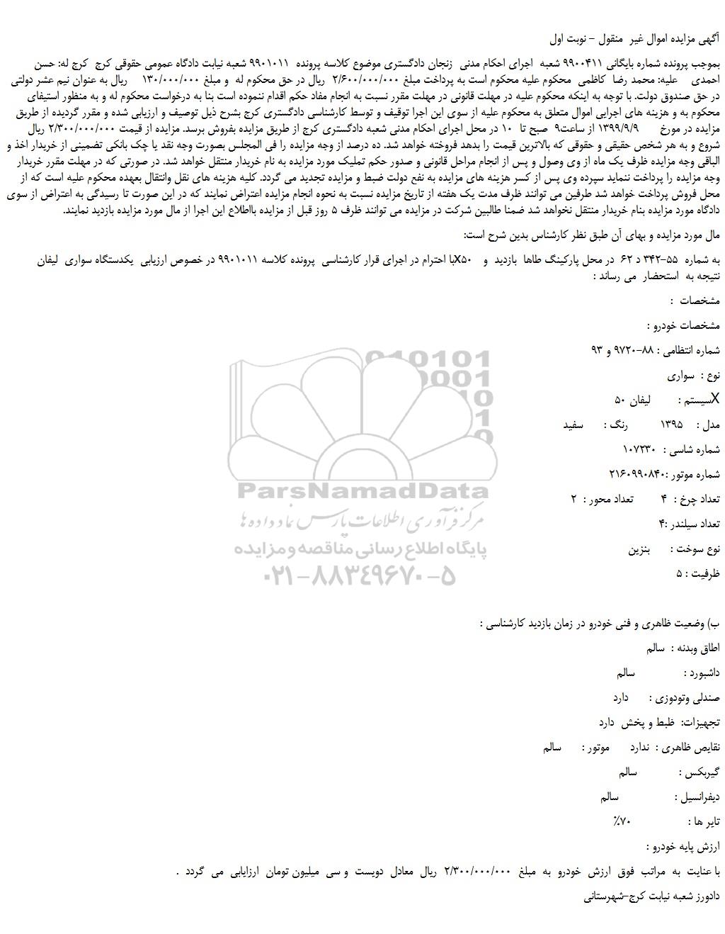 با احترام در اجرای قرار کارشناسی پرونده کلاسه 9901011 در خصوص ارزیابی یکدستگاه سواری لیفان x50 به شماره 55-342 د 62 در محل پارکینگ طاها بازدید و نتیجه به استحضار می رساند :