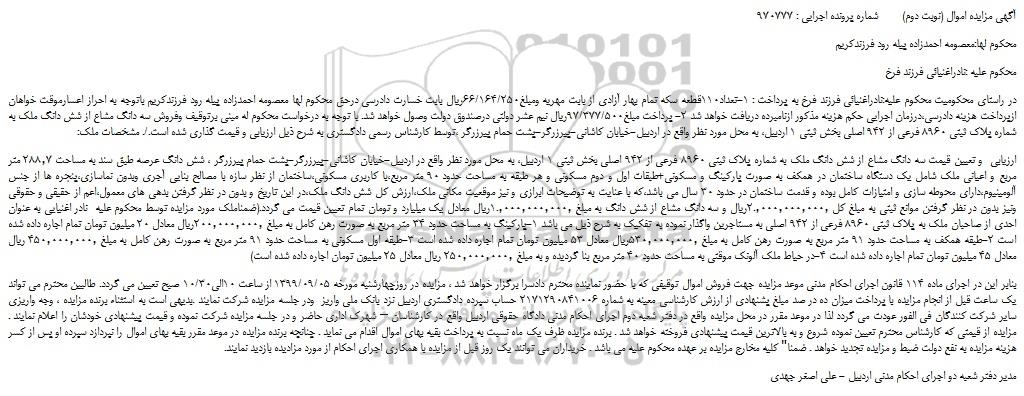 آگهی مزایده اموال (نوبت دوم) شماره پرونده اجرایی : 970777