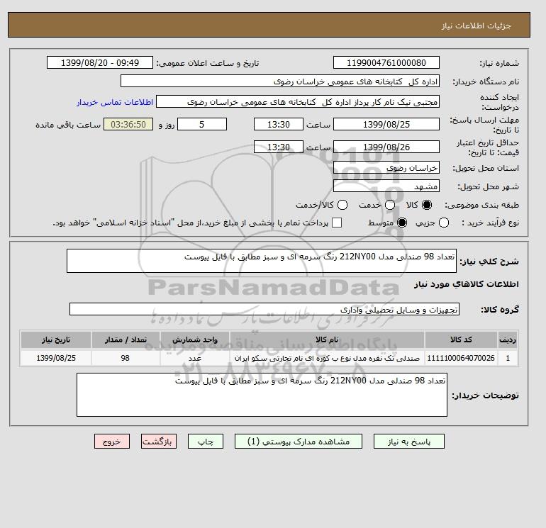 شرح کلی نیاز: تعداد 98 صندلی مدل 212NY00 رنگ سرمه ای و سبز مطابق با فایل ییوست