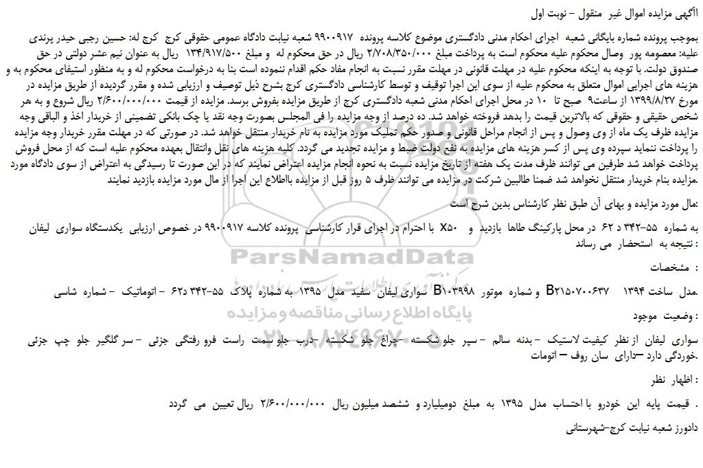 با احترام در اجرای قرار کارشناسی پرونده کلاسه 9900917 در خصوص ارزیابی یکدستگاه سواری لیفان x50 به شماره 55-342 د 62 در محل پارکینگ طاها بازدید و نتیجه به استحضار می رساند :