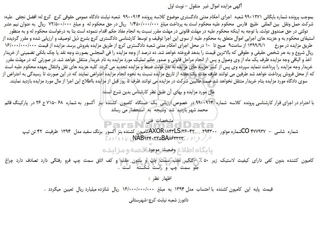 بموجب پرونده شماره بایگانی 9901271 شعبه اجرای احکام مدنی دادگستری موضوع کلاسه پرونده 9900914 شعبه نیابت دادگاه عمومی حقوقی کرج کرج له: افضل نجفی علیه: شرکت حمل ونقل بین المللی خلیج فارس محکوم علیه محکوم است به پرداخت مبلغ 1/450/000/000 ریال در حق محکوم له و مبلغ 72/500/000 ریال به عنوان نیم عشر دولتی در حق صندوق دولت. با توجه به اینکه محکوم علیه در مهلت قانونی در مهلت مقرر نسبت به انجام مفاد حکم اقدام ننموده است بنا به درخواست محکوم له و به منظور استیفای محکوم به و هزینه های اجرایی اموال متعلق به محکوم علیه از سوی این اجرا توقیف و توسط کارشناسی دادگستری کرج بشرح ذیل توصیف و ارزیابی شده و مقرر گردیده از طریق مزایده در مورخ 1399/9/1 از ساعت9 صبح تا 10 در محل اجرای احکام مدنی شعبه دادگستری کرج از طریق مزایده بفروش برسد. مزایده از قیمت 16/000/000/000 ریال شروع و به هر شخص حقیقی و حقوقی که بالاترین قیمت را بدهد فروخته خواهد شد. ده درصد از وجه مزایده را فی المجلس بصورت وجه نقد یا چک بانکی تضمینی از خریدار اخذ و الباقی وجه مزایده ظرف یک ماه از وی وصول و پس از انجام مراحل قانونی و صدور حکم تملیک مورد مزایده به نام خریدار منتقل خواهد شد. در صورتی که در مهلت مقرر خریدار وجه مزایده را پرداخت ننماید سپرده وی پس از کسر هزینه های مزایده به نفع دولت ضبط و مزایده تجدید می گردد. کلیه هزینه های نقل وانتقال بعهده محکوم علیه است که از محل فروش پرداخت خواهد شد طرفین می توانند ظرف مدت یک هفته از تاریخ مزایده نسبت به نحوه انجام مزایده اعتراض نمایند که در این صورت تا رسیدگی به اعتراض از سوی دادگاه مورد مزایده بنام خریدار منتقل نخواهد شد ضمنا طالبین شرکت در مزایده می توانند ظرف 5 روز قبل از مزایده بااطلاع این اجرا از مال مورد مزایده بازدید نمایند.