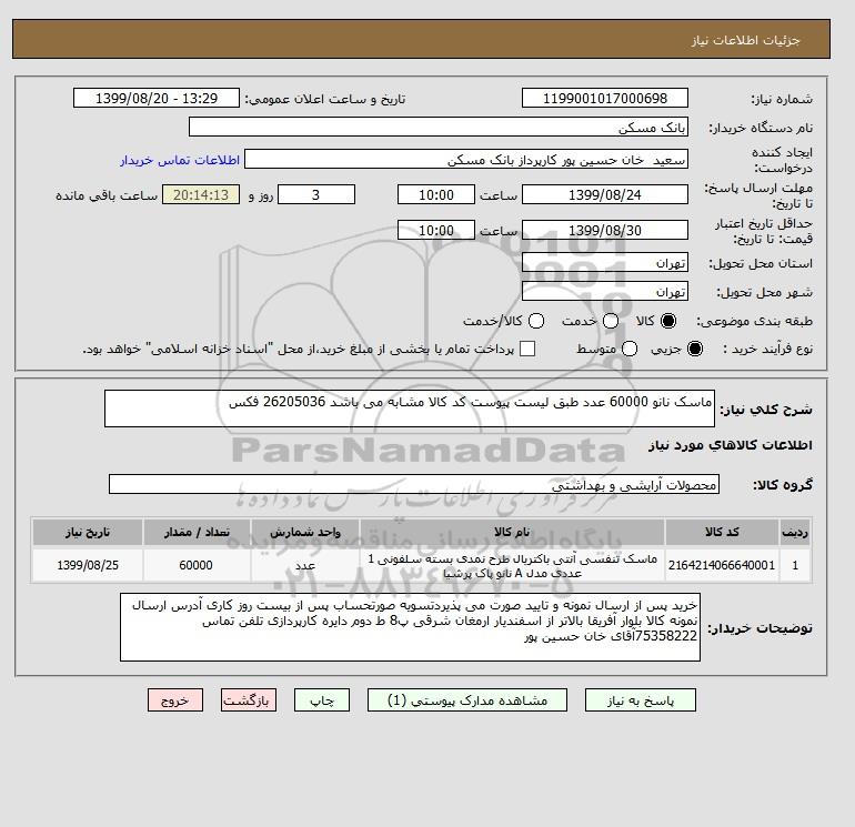 استعلام ماسک نانو 60000 عدد طبق لیست پیوست کد کالا مشابه می باشد 26205036 فکس, استعلام ماسک نانو 60000 عدد طبق لیست پیوست کد کالا مشابه می باشد 26205036 فکس
