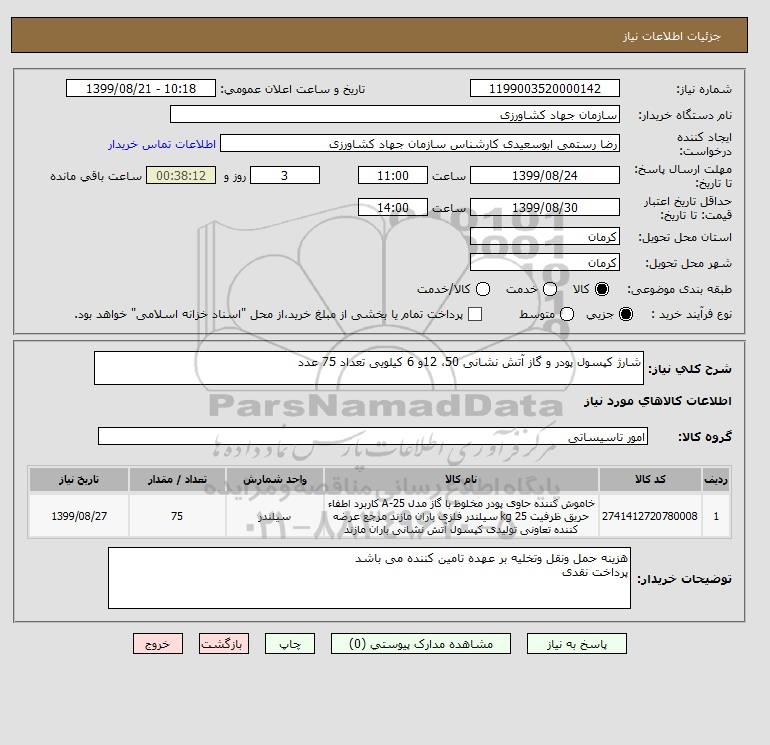 شرح کلی نیاز: شارژ کپسول پودر و گاز آتش نشانی 50، 12و 6 کیلویی تعداد 75 عدد