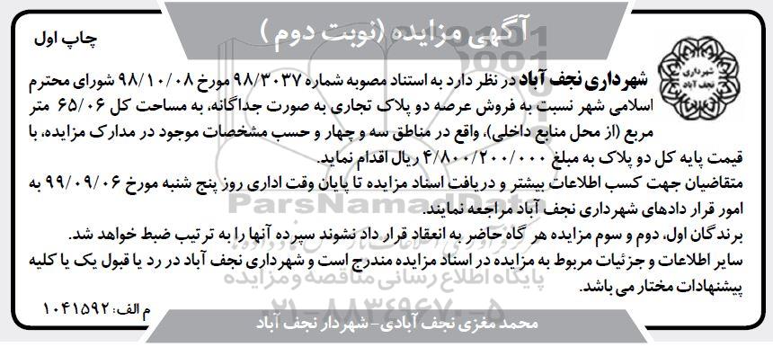 مزایده فروش عرصه دو پلاک تجاری نوبت دوم چاپ اول