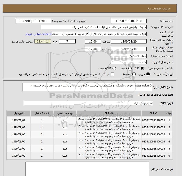 شرح کلی نیاز: nylon 6 مطابق خواص مکانیکی و مشخصات پیوست - کالا باید ایرانی باشد - هزینه حمل با فروشنده -