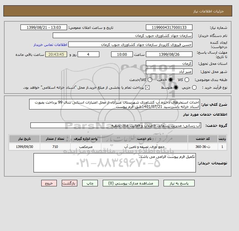 شرح کلی نیاز: احداث استخرهای ذخیره آب کشاورزی شهرستان عنبرآباد-از محل اعتبارات استانی سال 99 پرداخت بصورت اسناد خزانه باسررسید 1401/07/21طبق فرم پیوست