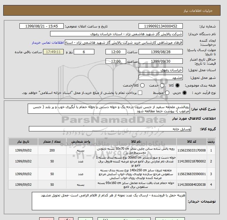نام دستگاه خریدار:شرکت پالایش گاز شهید هاشمی نژاد - استان خراسان رضوی