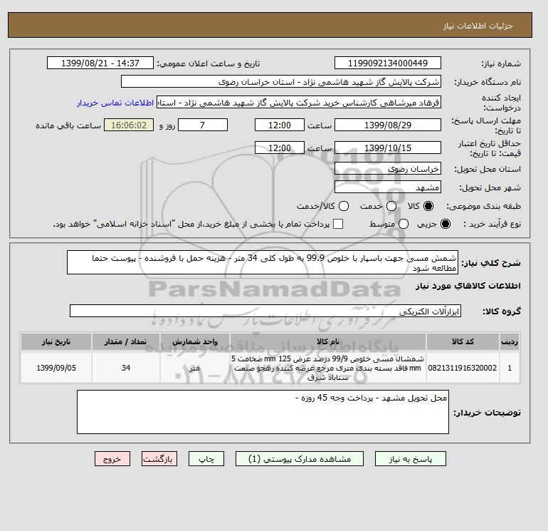 نام دستگاه خریدار:شرکت پالایش گاز شهید هاشمی نژاد - استان خراسان رضوی