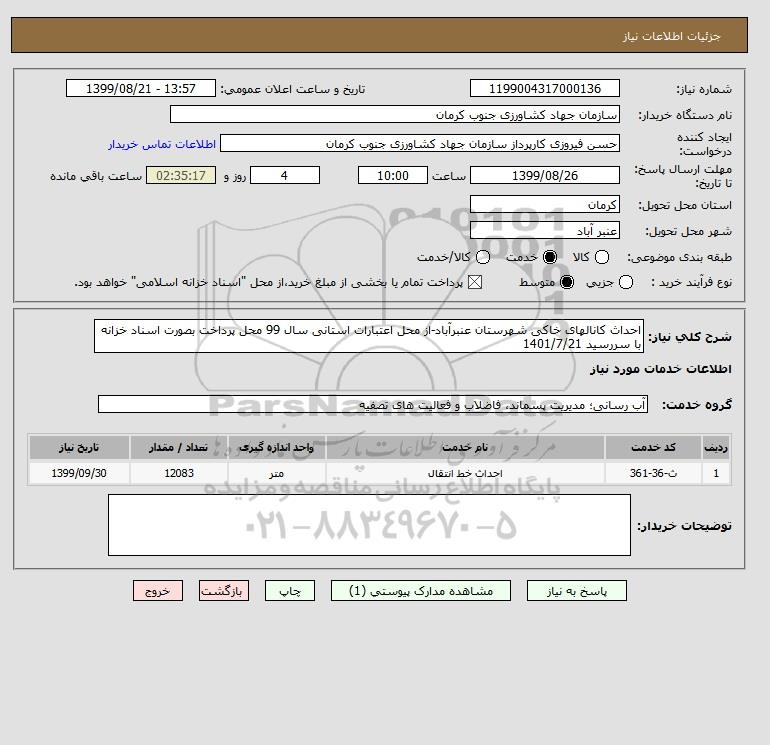 شرح کلی نیاز: احداث کانالهای خاکی شهرستان عنبرآباد-از محل اعتبارات استانی سال 99 محل پرداخت بصورت اسناد خزانه با سررسید 1401/7/21