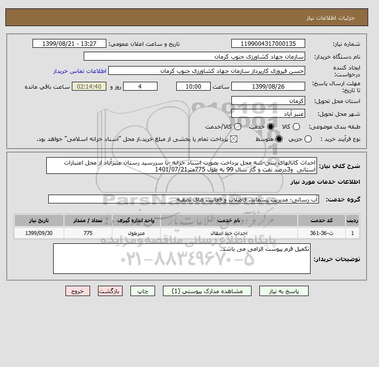 شرح کلی نیاز: احداث کانالهای بتنی-شه مجل پرداخت بصورت اسناد خزانه -با سررسید رستان عنبرآباد از محل اعتبارات استانی و3درصد نفت و گاز سال 99 به طول 775متر1401/07/21
