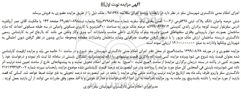 اجرای احکام مدنی دادگستری شهرستان سقز در نظر دارد در رابطه با پرونده اجرائی بکلاسه 981648 ، ملک ذیل را از طریق مزایده حضوری به فروش برساند.
