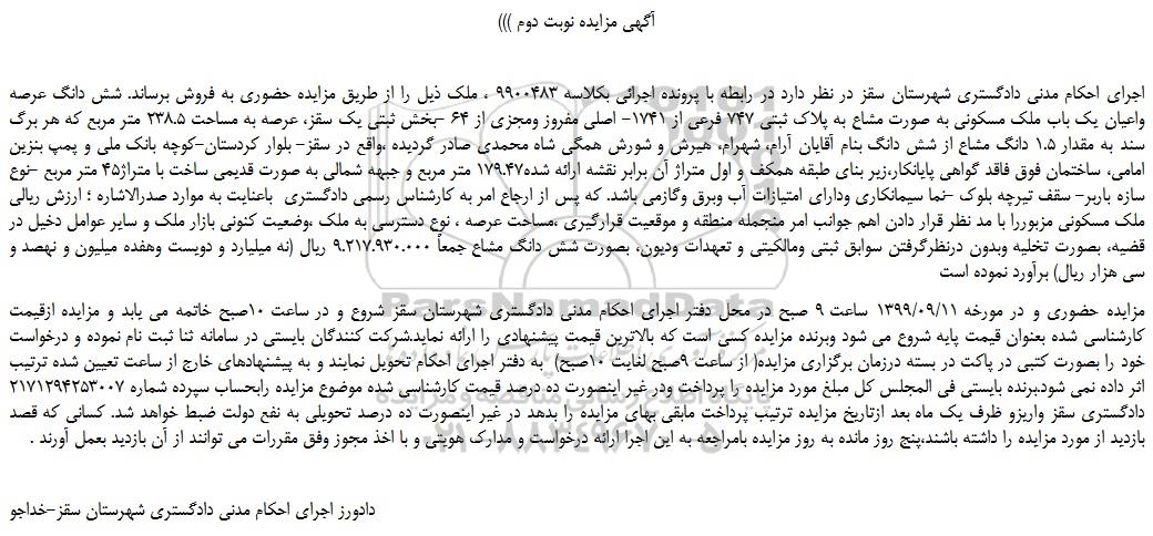 اجرای احکام مدنی دادگستری شهرستان سقز در نظر دارد در رابطه با پرونده اجرائی بکلاسه 9900483 ، ملک ذیل را از طریق مزایده حضوری به فروش برساند. شش دانگ عرصه واعیان یک باب ملک مسکونی به صورت مشاع به پلاک ثبتی 747 فرعی از 1741- اصلی مفروز ومجزی از 64 -بخش ثبتی یک سقز، عرصه به مساحت 238.5 متر مربع که هر برگ سند به مقدار 1.5 دانگ مشاع از شش دانگ بنام آقایان آرام، شهرام، هیرش و شورش همگی شاه محمدی صادر گردیده ،واقع در سقز- بلوار کردستان-کوچه بانک ملی و پمپ بنزین امامی، ساختمان فوق فاقد گواهی پایانکار،زیر بنای طبقه همکف و اول متراژ آن برابر نقشه ارائه شده179.47 متر مربع و جبهه شمالی به صورت قدیمی ساخت با متراژ45 متر مربع -نوع سازه باربر- سقف تیرچه بلوک -نما سیمانکاری ودارای امتیازات آب وبرق وگازمی باشد. که پس از ارجاع امر به کارشناس رسمی دادگستری باعنایت به موارد صدرالاشاره ؛ ارزش ریالی ملک مسکونی مزبوررا با مد نظر قرار دادن اهم جوانب امر منجمله منطقه و موقعیت قرارگیری ،مساحت عرصه ، نوع دسترسی به ملک ،وضعیت کنونی بازار ملک و سایر عوامل دخیل در قضیه، بصورت تخلیه وبدون درنظرگرفتن سوابق ثبتی ومالکیتی و تعهدات ودیون، بصورت شش دانگ مشاع جمعاً 9.217.930.000 ریال (نه میلیارد و دویست وهفده میلیون و نهصد و سی هزار ریال) برآورد نموده است