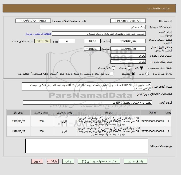 شرح کلی نیاز: کاغذ کاربن لس 70*100 سفید و زرد طبق لیست پیوست(از هر رنگ 250 بند)ارسال پیش فاکتور پیوست الزامی است