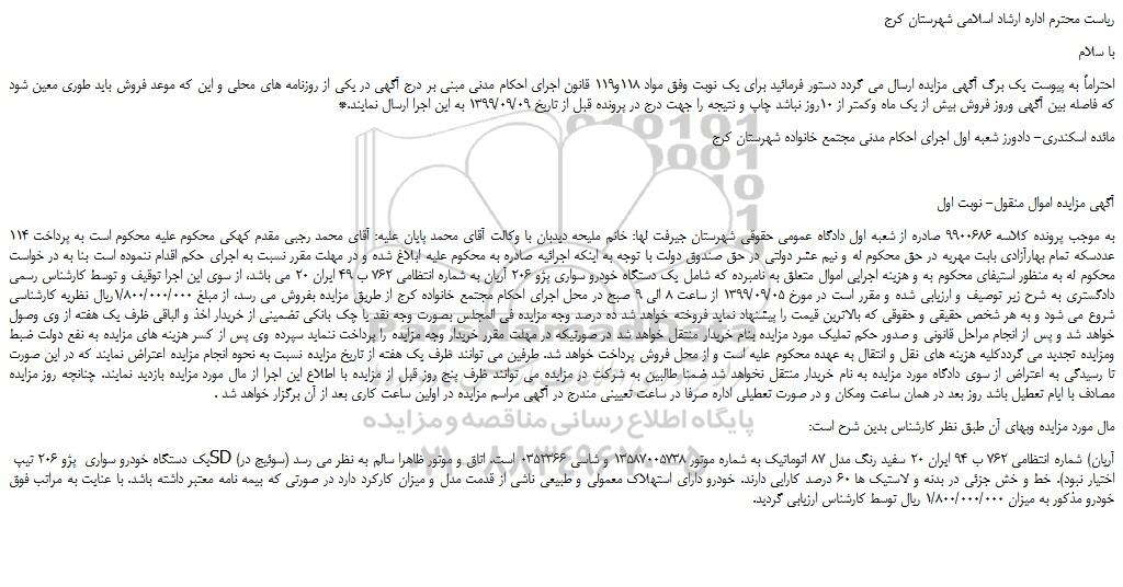 به موجب پرونده کلاسه 9900686 صادره از شعبه اول دادگاه عمومی حقوقی شهرستان جیرفت لها: خانم ملیحه دیدبان با وکالت آقای محمد پایان علیه: آقای محمد رجبی مقدم کهکی محکوم علیه محکوم است به پرداخت 114 عددسکه تمام بهارآزادی بابت مهریه در حق محکوم له و نیم عشر دولتی در حق صندوق دولت با توجه به اینکه اجرائیه صادره به محکوم علیه ابلاغ شده و در مهلت مقرر نسبت به اجرای حکم اقدام ننموده است بنا به در خواست محکوم له به منظور استیفای محکوم به و هزینه اجرایی اموال متعلق به نامبرده که شامل یک دستگاه خودرو سواری پژو 206 آریان به شماره انتظامی 762 ب 49 ایران 20 می باشد، از سوی این اجرا توقیف و توسط کارشناس رسمی دادگستری به شرح زیر توصیف و ارزیابی شده و مقرر است در مورخ 1399/09/05 از ساعت 8 الی 9 صبح در محل اجرای احکام مجتمع خانواده کرج از طریق مزایده بفروش می رسد، از مبلغ 1/800/000/000ریال نظریه کارشناسی شروع می شود و به هر شخص حقیقی و حقوقی که بالاترین قیمت را پیشنهاد نماید فروخته خواهد شد ده درصد وجه مزایده فی المجلس بصورت وجه نقد یا چک بانکی تضمینی از خریدار اخذ و الباقی ظرف یک هفته از وی وصول خواهد شد و پس از انجام مراحل قانونی و صدور حکم تملیک مورد مزایده بنام خریدار منتقل خواهد شد در صورتیکه در مهلت مقرر خریدار وجه مزایده را پرداخت ننماید سپرده وی پس از کسر هزینه های مزایده به نفع دولت ضبط ومزایده تجدید می گرددکلیه هزینه های نقل و انتقال به عهده محکوم علیه است و از محل فروش پرداخت خواهد شد. طرفین می توانند ظرف یک هفته از تاریخ مزایده نسبت به نحوه انجام مزایده اعتراض نمایند که در این صورت تا رسیدگی به اعتراض از سوی دادگاه مورد مزایده به نام خریدار منتقل نخواهد شد ضمنا طالبین به شرکت در مزایده می توانند ظرف پنج روز قبل از مزایده با اطلاع این اجرا از مال مورد مزایده بازدید نمایند. چنانچه روز مزایده مصادف با ایام تعطیل باشد روز بعد در همان ساعت ومکان و در صورت تعطیلی اداره صرفا در ساعت تعیینی مندرج در آگهی مراسم مزایده در اولین ساعت کاری بعد از آن برگزار خواهد شد .
